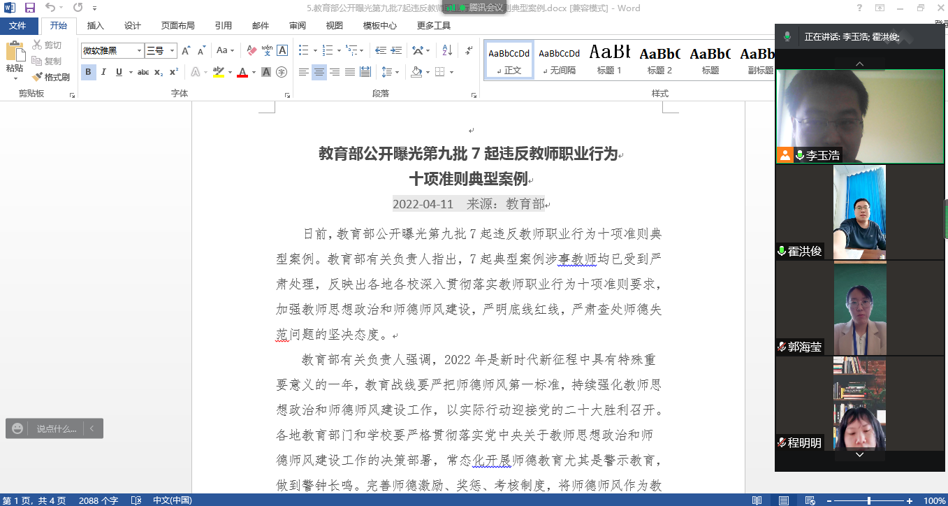 本次活动,全体教工认真学习,深入领会,通过学习第九批7起违反教师职业行为十项准则典型案例,学院全体教师引以为戒,做到警钟长鸣,切实弘扬良好师德师风,明确师德底线红线;同时,进一步增强教工履行疫情防控意识,落实疫情防控责任,确保全体教工安全健康和学校安全稳定。
