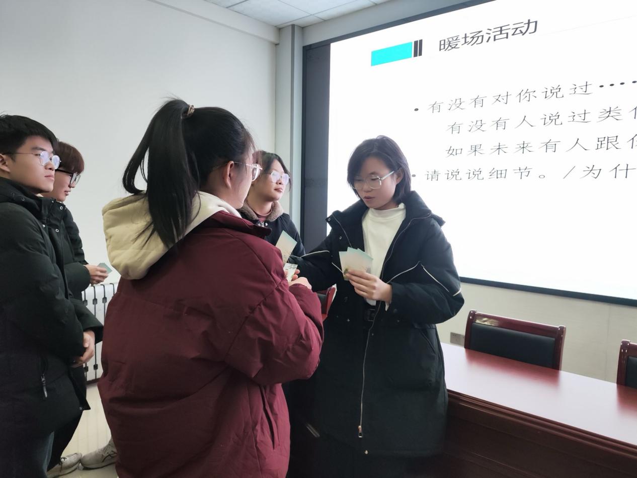 在实操环节,张欣艺引导学生进行正念冥想,帮助他们专注呼吸、觉察当下,将杂念排出脑海。现场氛围静谧平和,大家闭目凝神,体验了一场心灵的放松之旅。随后的互动游戏环节,学生们在欢声笑语中增进了彼此的了解和信任,增强了团队凝聚力。他们分享了自己在学习和生活中面临的压力,以及如何应对这些压力的经验和方法。