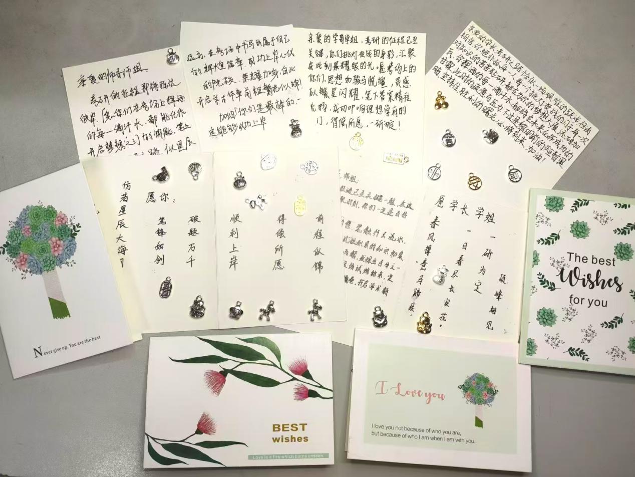 活动中,学生们精心设计并制作了一系列带有鼓励话语和温馨图案的定制卡片,如“考研加油,你一定行!”和“坚持就是胜利,冲呀!”等,以此传递对考研学子的期望和支持。这些卡片不仅承载着满满的正能量,也为考研学子提供了坚定前行的力量。