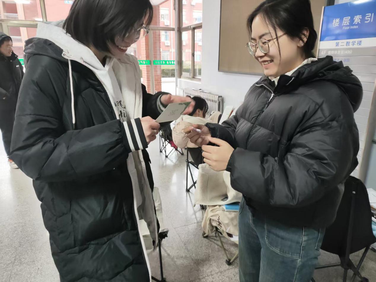 学生们组成流动小组,在教学楼旁寻找正在备考的考研学生,亲手将这些温暖的礼物送到他们手中,并送上真挚的祝福和鼓励。备战考研的学生们对这份突如其来的温暖礼物感到惊喜,这些真挚的话语如同冬日里的暖阳,慰藉了他们疲惫的心灵,激励他们在考研的道路上更加努力,勇敢追逐梦想。