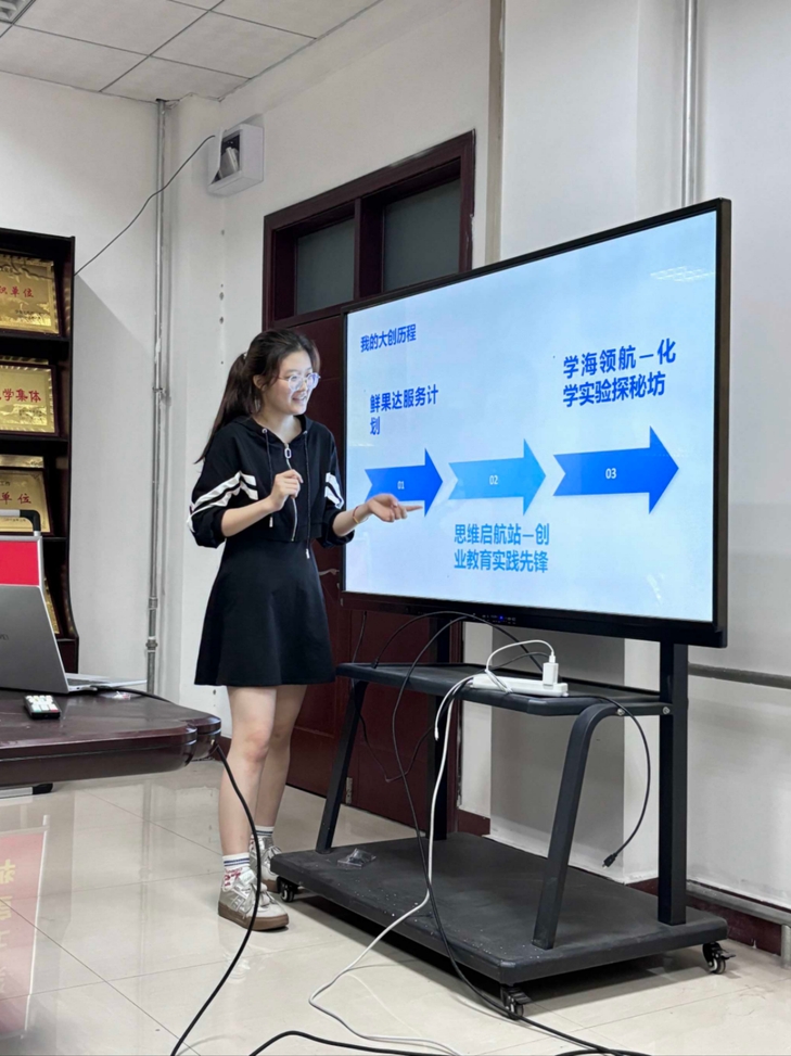 校学生会科技创新部部长田振同学系统阐释了“互联网+”大学生创新创业大赛与“挑战杯”全国大学生系列科技学术竞赛的赛制框架。他围绕赛事分类、评审维度、项目孵化路径等关键环节展开剖析,结合兄弟院校优秀案例与今年会实际情况进行对比分析,为大家厘清了备赛方向与策略重点。随后,校大学生创新创业孵化基地优秀项目负责人王玺同学作专题分享。她以第一视角复盘参赛历程,从团队构建、技术论证、商业计划书撰写到答辩技巧,全方位梳理实战经验。其分享既包含时间管理、跨学科协作等普适性方法,又针对化工学科特点提出专业建议使复杂内容易于理解。